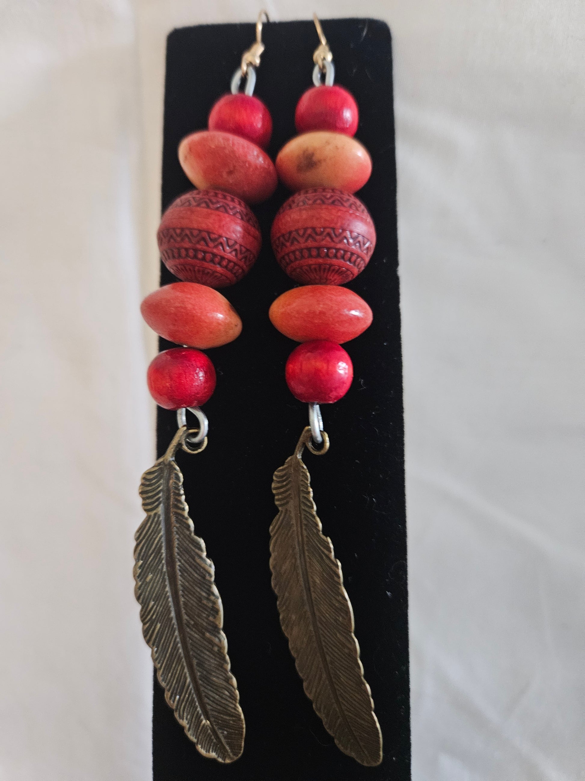These earrings feature vibrant red wooden beads paired with apple-colored glass beads, creating a striking contrast that draws attention. Accented with delicate copper feathers, they offer a unique blend of natural and artisan craftsmanship. Perfect for those who appreciate distinctive, earthy accessories that combine color and texture with subtle metallic detail.