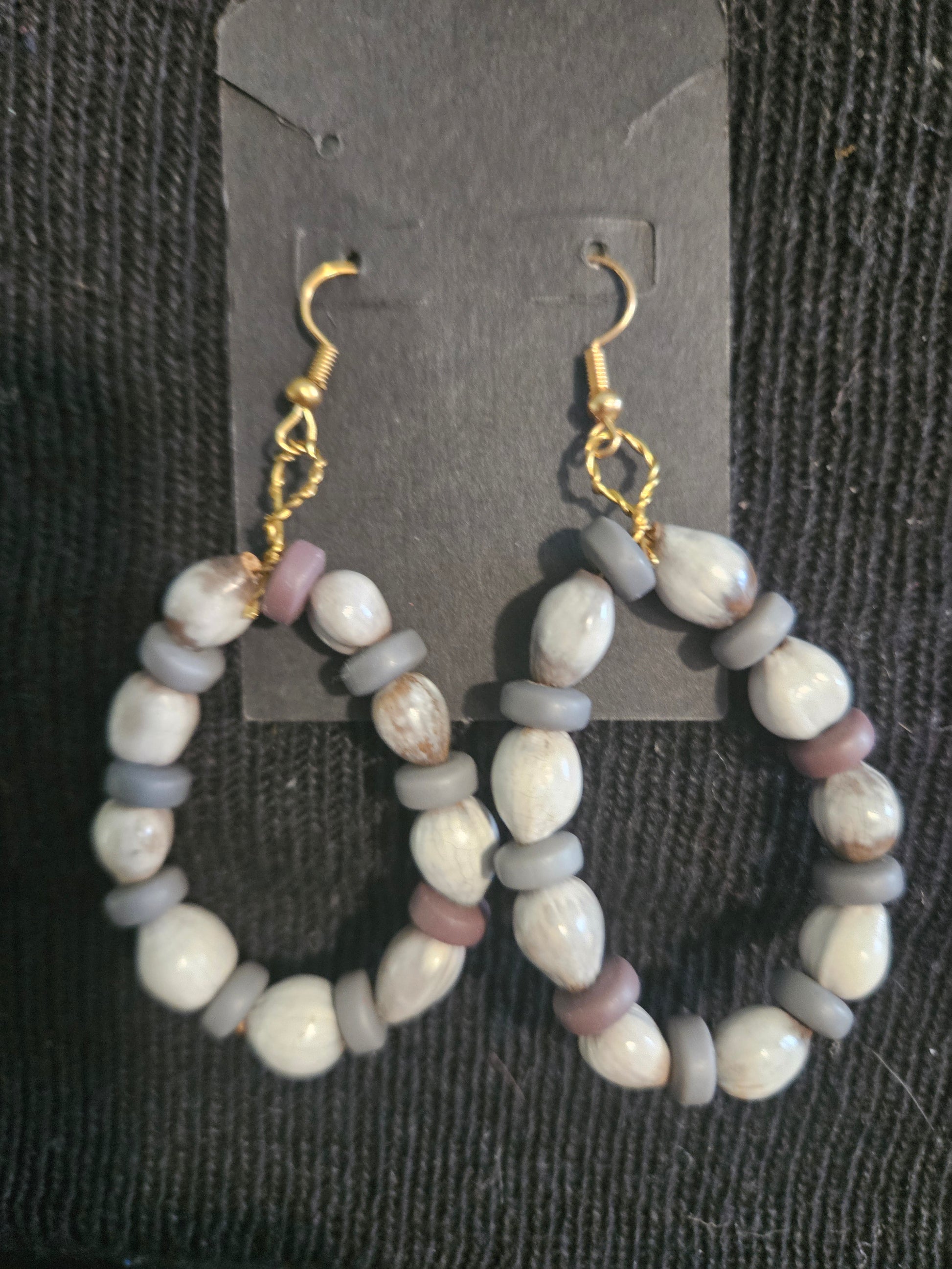 These "Grey Skies" earrings showcase a refined blend of natural seed beads paired with elegant gray clay spacers. Their loop-shaped dangle design offers a subtle yet sophisticated movement, making them a versatile accessory that complements both casual and formal attire with expert craftsmanship and understated style.