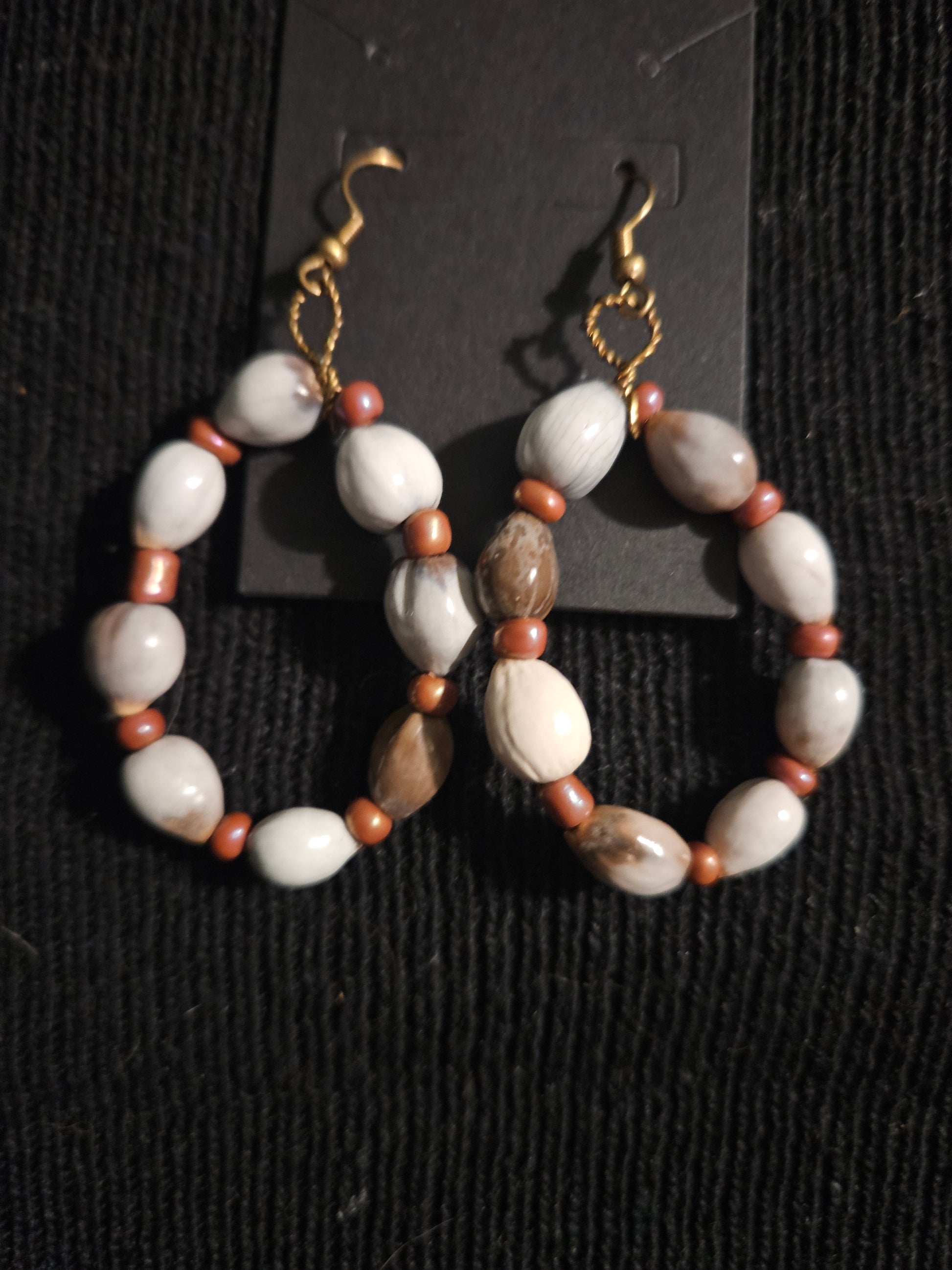 These expert-crafted Harvest earrings feature elegant loops adorned with authentic gray and white seeds, accented by subtle, shiny brown spacer beads. Their refined design offers a balanced blend of natural tones, perfect for adding a touch of heritage to any outfit. Lightweight and versatile, these earrings provide both comfort and style for everyday wear or special occasions.
