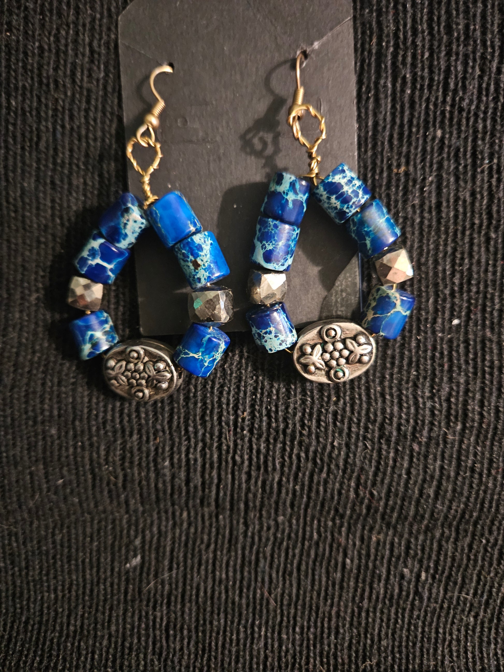 Discover the Healing Waters earrings, featuring tear drop style and stone beads with a unique water pattern. Each bead is complemented by lustrous hematite and an intricately designed silver oval bead, adding elegance and depth. These earrings blend natural elements with refined craftsmanship, offering both visual harmony and a grounding energy to your ensemble. Ideal for those seeking pieces that combine beauty and healing with meaningful design.