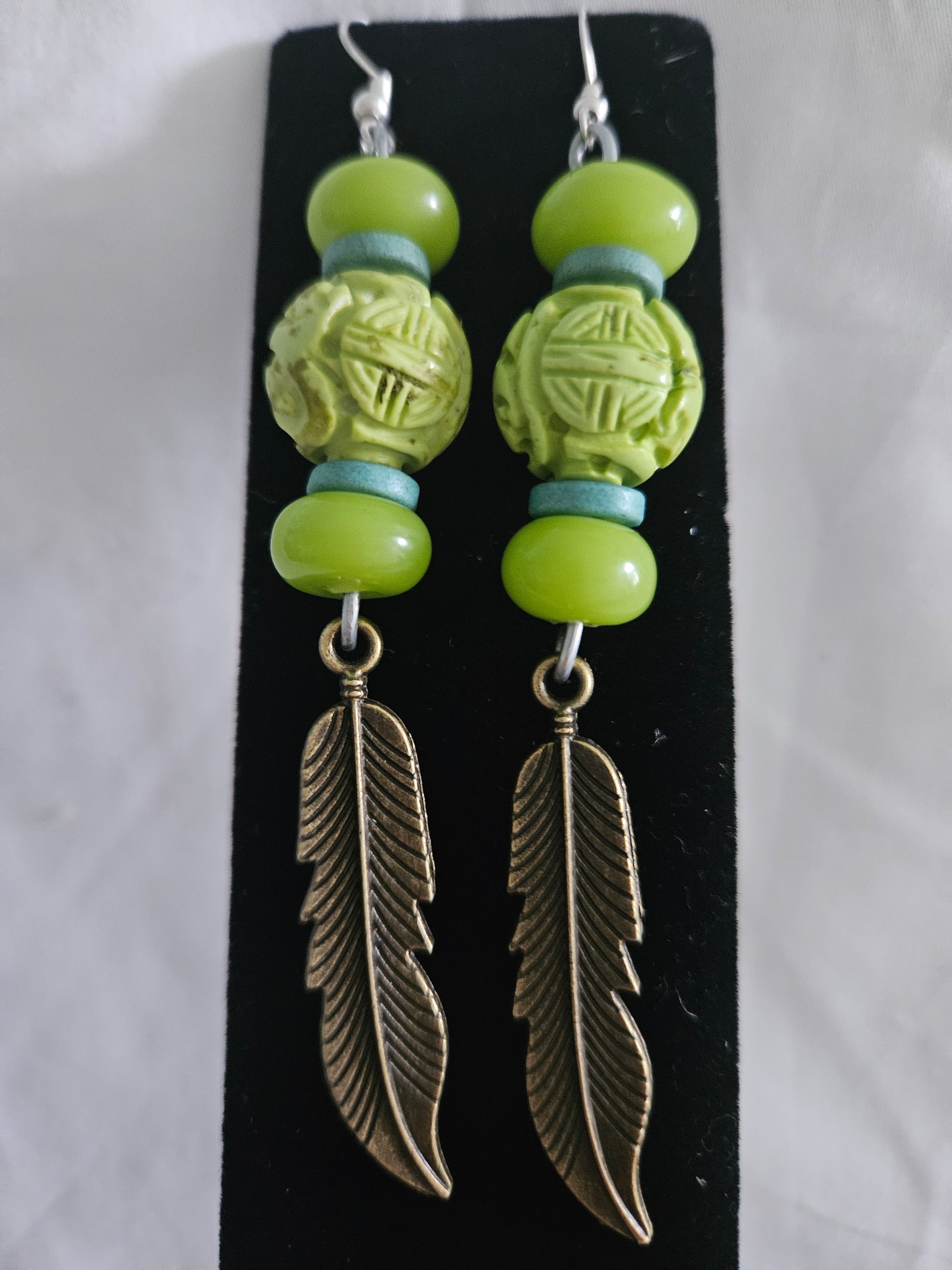 These expertly crafted earrings feature green ornate carved beads paired with genuine jade stones, accented by delicate turquoise beads for a refined touch. Copper feathers add a unique, artisanal element, blending natural materials with intricate design. Ideal for those who appreciate jewelry that combines elegance with meaningful craftsmanship.
