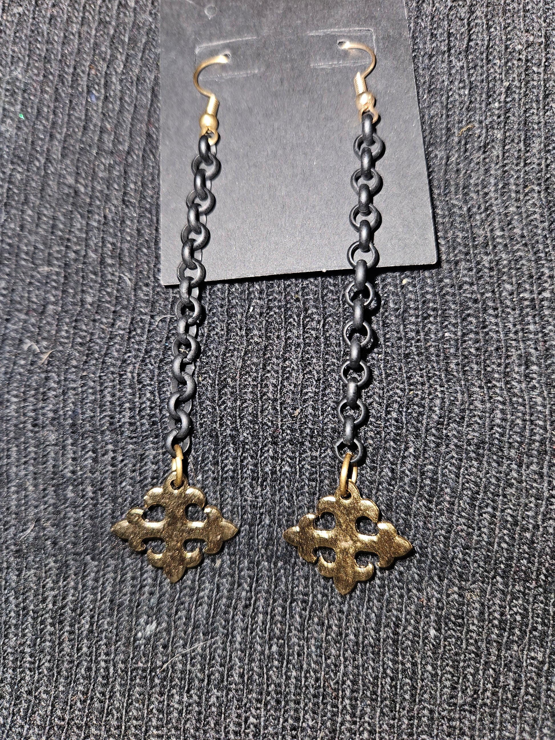 Northern Star earrings combine sleek black chains with intricately crafted gold Celtic cross charms, offering a refined balance of modern edge and timeless symbolism. Expertly designed, these earrings add a distinctive touch to any ensemble while honoring heritage with subtle elegance.