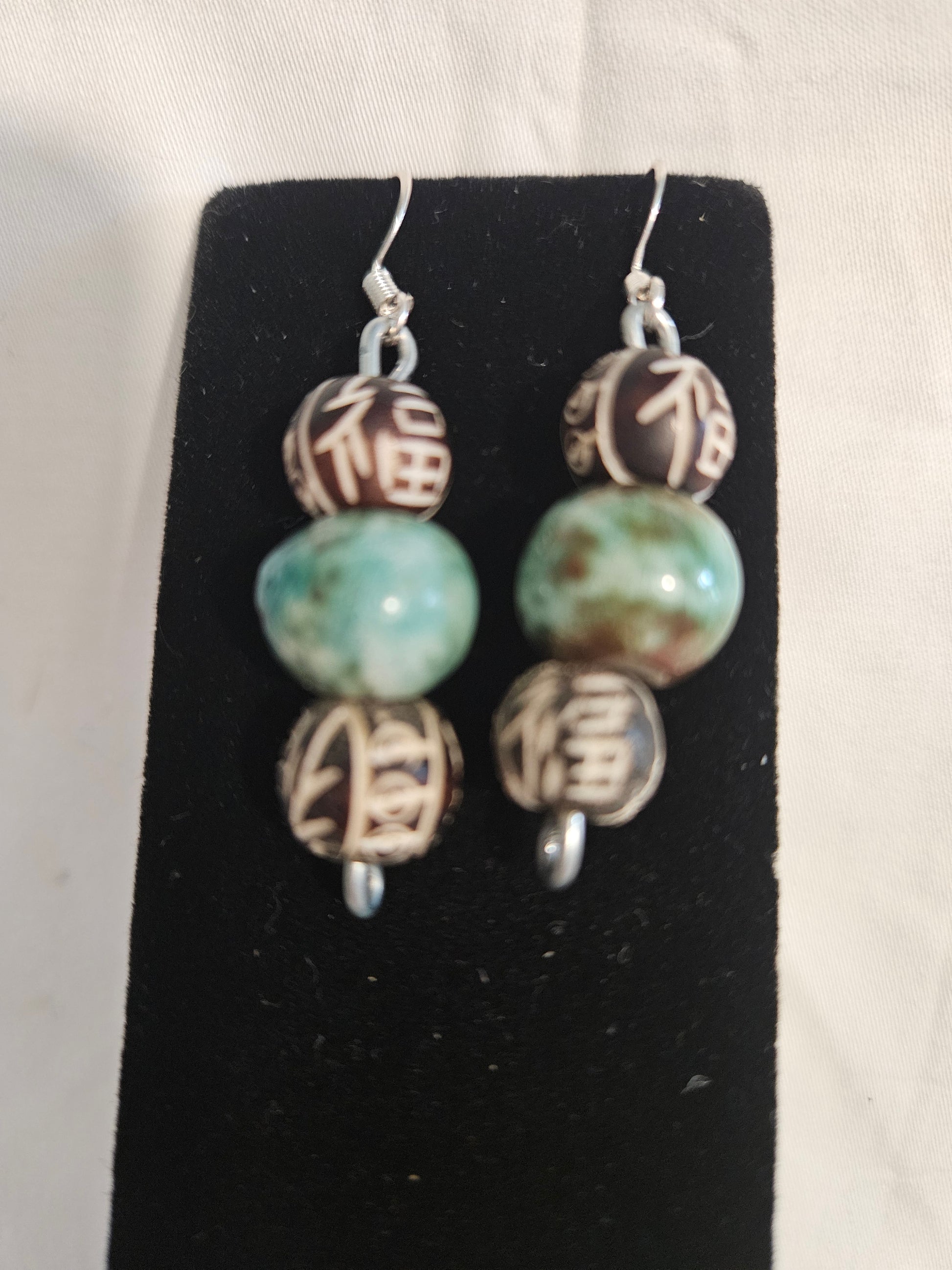These "Oriental Waters" earrings combine intricately carved oriental wooden beads with smooth, ocean-colored stone beads, creating a sophisticated balance of natural textures and serene hues. Expertly crafted, they offer a unique aesthetic that complements both casual and elegant styles, highlighting an appreciation for artisanal detail and timeless design. Ideal for those seeking refined, culturally inspired accessories that bring subtle elegance to any ensemble.