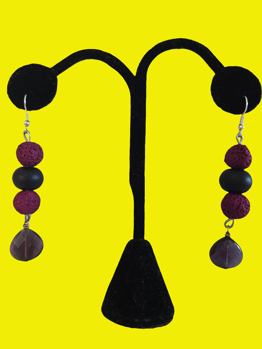 These elegant earrings combine the deep, grounding hues of black onyx-colored stones with the vibrant burst of purple lava beads and shimmering purple chandelier crystals. Expertly crafted, they offer a striking balance of natural texture and refined sparkle, making them ideal for adding sophisticated color and drama to any ensemble.